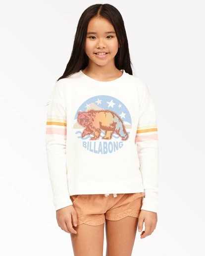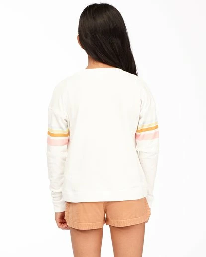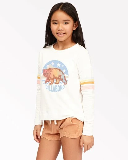 Bring it back to the best coast with this retro-inspired girls sweatshirt. The lightweight pullover is made from soft french terry and cut with a relaxed fit, topped with multicolor athletic stripes printed at the sleeves and graphic hits at the left chest and center back.