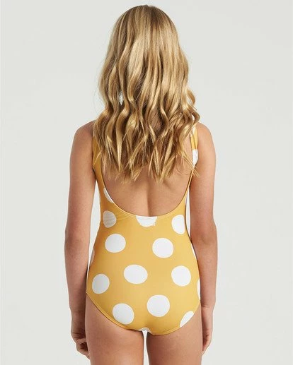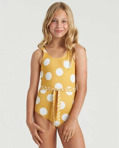 With sunny dots throughout, this girls swimsuit is pure retro gold. An active take on a vintage polka dot swimsuit, the 4Ever Sun plays with mixed large and small scale dot prints on a scoop neck one piece. A contrast print belt ties a the center front, offering up bodysuit versatility.