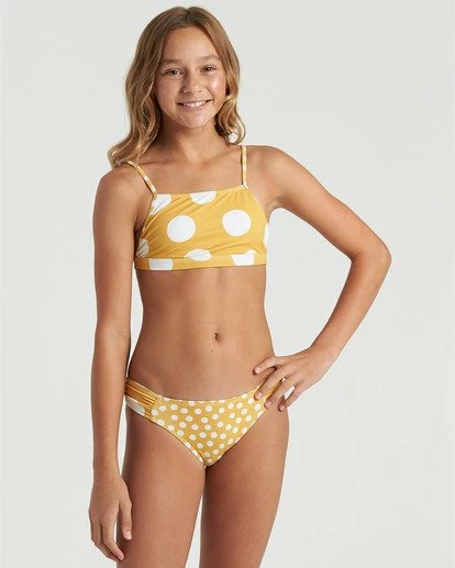 With sunny dots throughout, this girls bikini is pure retro gold. A modern take on a vintage polka dot bikini, the 4Ever Sun plays with mixed large and small scale dot prints on a cropped tank bikini top and tab side bikini bottoms. The top updates a bralette silhouette, adding a square neckline design.