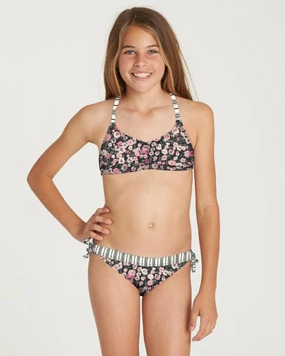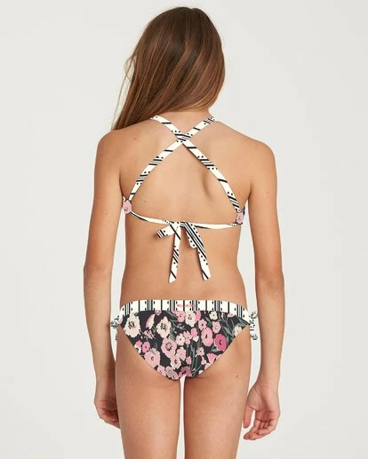 Sometimes opposites make the best buds! Stripes and ditsy florals make a perfect pairing in this mixed print, reversible bikini set. The top features adjustable crossback straps and reverses from ditsy floral to stripes. The bottoms mix both patterns on a tie side bikini.