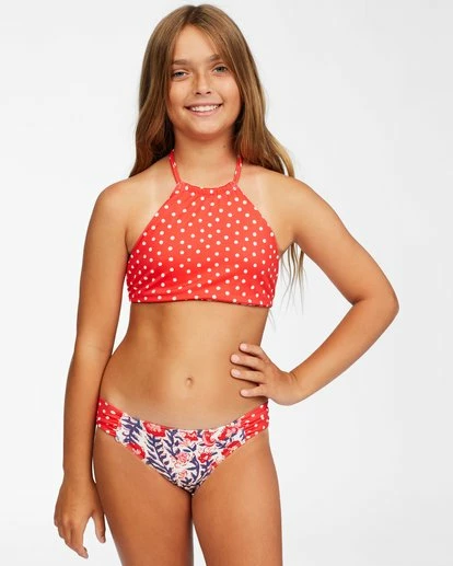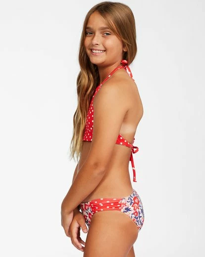 Exercise your freedom to choose with this mixed print, reversible bikini set. Giving you the freedom to change it up, the reversible halter bikini top ties at the neck and back for a fully adjustable fit. The mixed print bikini bottoms feature contrast print tabs a the sides for a comfortable fit.