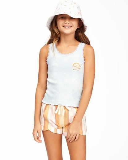 If you’re looking for us, you can find us playing In The Waves. This girls’ tank top delivers a totally chilled out vibe with a tie-dye wash and loose ruffle hem finish. Made with soft and stretchy Pointelle rib knit fabric, the tank offers a fitted shape with cool lace trim detailing around the neck and armholes. The summer staple for girls is finished with a custom artwork graphic on the front left chest.