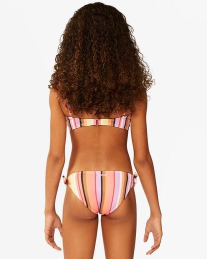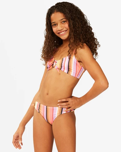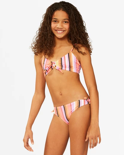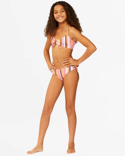 Slow down and soak up the sun. The Girls’ Knot So Fast Hanky Tie Trilet Bikini Set is made for living in the moment. This bikini set for girls includes a bralette bikini top with knotted tie at the front and a full coverage bottom. The perfect suit for making a splash, this set is made from stretchy recycled fabric with a timeless striped print.
