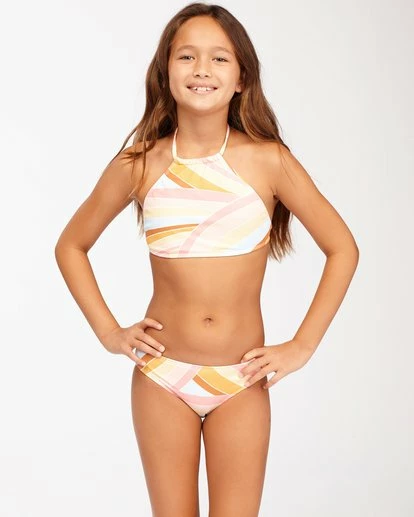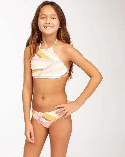 Swirling lines of color paired with a sleek design make the Girls’ Sea Of Gold High Neck Bikini Set a standout of the season. The Girls’ bikini set elevates your swimwear collection with a high neck style that also doubles as a crop top you can pair with shorts or a flowy skirt. Made with soft and stretchy swim fabric, this bikini features spaghetti ties at the neck and center back, finished with embroidered logo detailing.