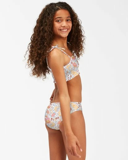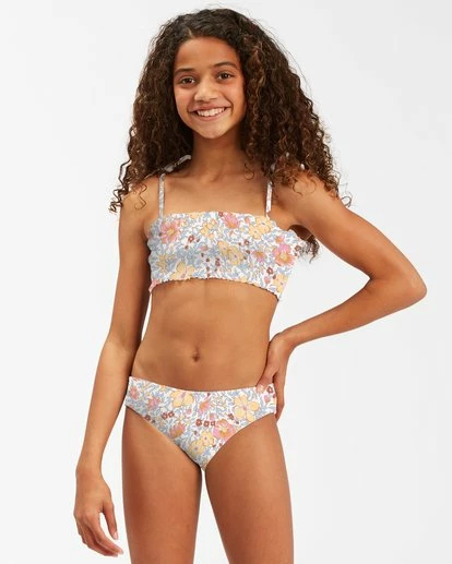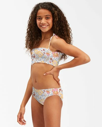 Like ice cream on a hot and sunny day, this floral bikini for girls is packed with summertime sweetness. The Girls’ Sweet Dreamer Smocked bikini set features a straight-across bandeau style top with smocked fabric and shoulder ties. The bottom delivers full bum coverage ideal for fun and games. And the fabric? It’s not only soft, stretchy and comfortable— it’s also recycled. Sweet, indeed.