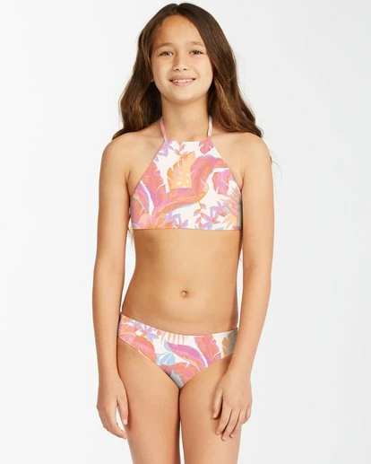 High vibes and sunny skies, the Girls’ Tropical Punch High Neck Bikini Set perfectly transitions between sun, sand and surf. The high neck swimsuit for girls features an all-over custom print with an embroidered logo and ties at the neck and center back. Full bum coverage keeps it comfortable all day long.