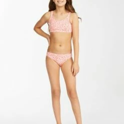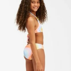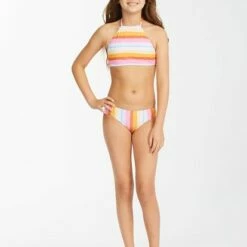 Mix and match the Girls’ Walk In The Sun Reversible High-Neck Bikini Set to create a look that’s true to you. Offering a choice of tropical palms or classic stripes, the Girls’ swimsuit offers a contemporary high-neck style with neck and back ties and a lowrider bottom with mid-level coverage. Made with premium swim fabric, the Girls’ swimsuit is finished with embroidered logo detailing.