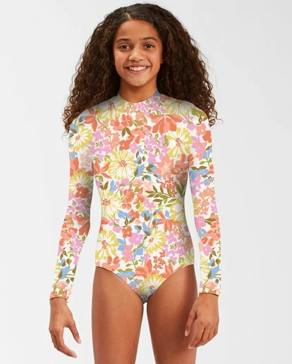 Wildflowers made for the wild child— Bloom brighter than the rest of the lineup with the Girls’ Windsong Long Sleeve Swimsuit. The perfect suit for long days and warm water sessions, this swimsuit for girls features a bold floral print on premium recycled stretch fabric. The classic fit is styled with a boy short bottom and zip back entry for easy on and off. Not only soft and comfortable, this saltwater essential also delivers enhanced UV protection so your ride only stops when the sun goes down.